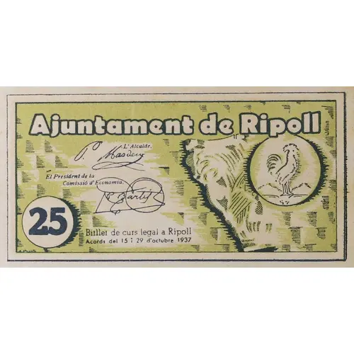 Ajuntament de Ripoll 25 Bitllet de curs legal a Ripoll Acords del 15 i 29 d` octubre 1937 (Translation: City Council of Ripoll Legal course banknote in Ripoll Agreements of October 15 and 29, 1937) |