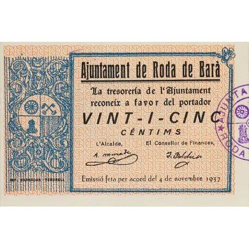 Ajuntament de Roda de Barà La Tresoreria de l`Ajuntament reconeix a favor del portador VINT-I-CINC CÉNTIMS Emissió feta per acord del 4 de novembre 1937 (Translation: City Council of Roda de Barà The City Treasury recognizes in favor of the bearer Twenty-five Centimos Issued by agreement of November 4, 1937) |