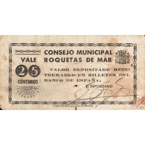 CONSEJO MUNICIPAL ROQUETAS DE MAR VALE 25 CÉNTIMOS VALOR DEPOSITADO REINTEGRABLE EN BILLETES DEL BANCO DE ESPAÑA. (Translation: Municipal Council Roquetas de Mar It`s worth 25 Centimos Deposited value refundable in banknotes from the Bank of Spain.) |