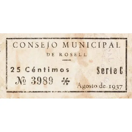 CONSEJO MUNICIPAL DE ROSELL 25 Céntimos Serie C Agosto de 1937 (Translation: Municipal Council of Rosell 25 Centimos Series C August of 1937) |