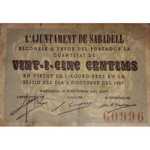 L`AJUNTAMENT DE SABADELL RECONEIX A FAVOR DEL PORTADOR LA QUANTITAT DE VINT-I-CINC CENTIMS EN VIRTUT DE L`ACORD PRES EN LA SESSIO DEL DIA 6 D`OCTUBRE DEL 1937 SABADELL, 11 D`OCTUBRE DEL 1937 (Translation: The City Council of Sabadell recognizes in favor of the bearer the amount of Twenty-five Centimos by virtue of the agreement taken in the session of October 6, 1937. Sabadell, October 11, 1937.) |