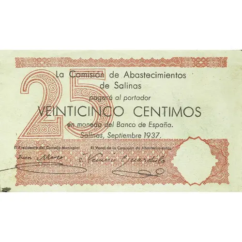25 La Comisión de Abastecimientos de Salinas pagará al portador VEINTICINCO CENTIMOS en moneda del Banco de España. Salinas, Septiembre 1937. (Translation: The Supply Commission of Salinas will pay the bearer Twenty-five Centimos in currency of the Bank of Spain. Salinas, September 1937.) |