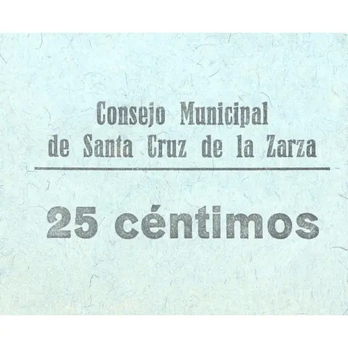 Consejo Municipal de Santa Cruz de la Zarza 25 céntimos (Translation: Municipal Council of Santa Cruz de la Zarza 25 Centimos) |