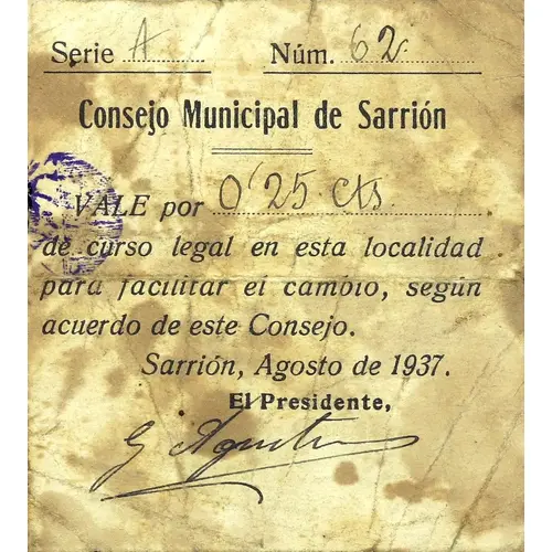 Consejo Municipal de Sarrión VALE por 0`25 cts. de curso legal en esta localidad para facilitar el cambio, según acuerdo de este Consejo. Sarrión, Agosto de 1937. (Translation: Municipal Council of Sarrión Voucher for 0.25 Centimos legal tender in this locality to facilitate the change, according to the agreement of this Council. Sarrión, August 1937.) |