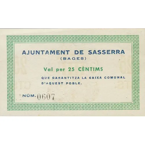 AJUNTAMENT DE SASSERRA (BAGES) Val per 25 CÈNTIMS QUE GARANTITZA LA CAIXA COMUNAL D`AQUEST POBLE (Translation: City Council of Sasserra (Bages) Valid for 25 Centimos Guaranted by the `Caixa Comunal` of this town) |