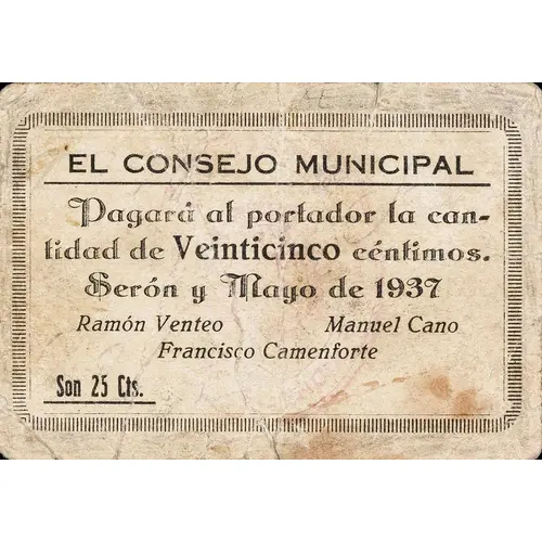 EL CONSEJO MUNICIPAL Pagará al portador la cantidad de Veinticinco céntimos Serón y Mayo de 1937 Son 25 Cts. (Translation: The Municipal Council Will pay the bearer the amount of Twenty-five Centimos. Serón and May 1937 It`s 25 Centimos) |