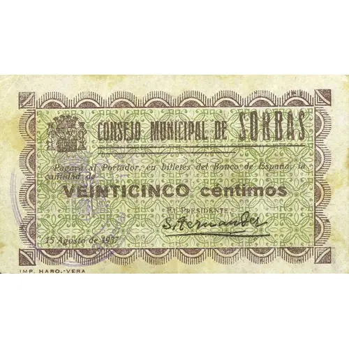 CONSEJO MUNICIPAL DE SORBAS Pagará al portador en billetes del Banco de España, la cantidad de VEINTICINCO céntimos 15 Agosto de 1937 IMP. HARO - VERA (Translation: Municipal Council of Sorbas Will pay the bearer in banknotes of the Bank of Spain, the amount of Twenty-five Centimos August 15, 1937) |