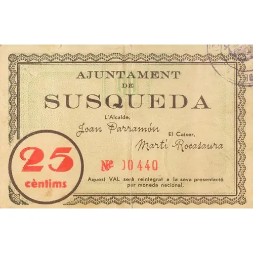 Emissió acordada el 15 d`Agost del 1937 de curs obligatori a Susqueda 25 cèntims (Translation: Issuance agreed on August 15, 1937 mandatory course in Susqueda 25 Centimos) |