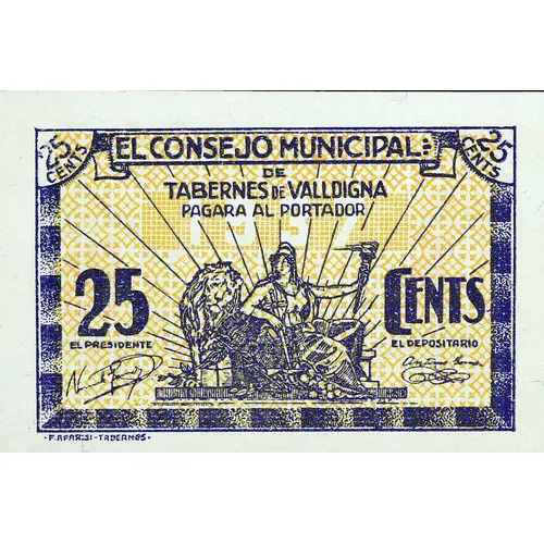 EL CONSEJO MUNICIPAL DE TABERNES DE VALLDIGNA PAGARA AL PORTADOR 1937 25 CENTS (Translation: The Municipal Council of Tabernes de Valldigna Will pay the bearer 25 Centimos) |