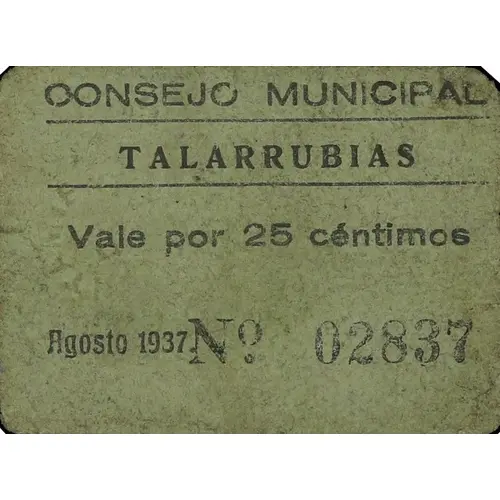 CONSEJO MUNICIPAL TALARRUBIAS Vale por 25 céntimos Agosto 1937. (Translation: Municipal Council Talarrubias Voucher for 25 Centimos August 1937.) |