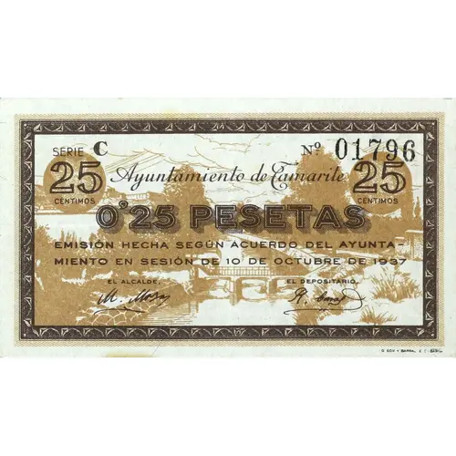 25 CÉNTIMOS Ayuntamiento de Tamarite 0`25 PESETAS EMISIÓN HECHA SEGÚN ACUERDO DEL AYUNTAMIENTO EN SESIÓN DE 10 DE OCUBRE DE 1937 (Translation: 25 Centimos City Council of Tamarite 0.25 Pesetas Emission made according to agreement of the city council in session of October 10, 1937) |