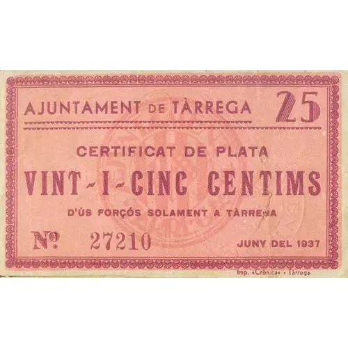 25 AJUNTAMENT DE TÀRREGA CERTIFICAT DE PLATA VINT-I-CINC CENTIMS D`ÚS FORÇÓS SOLAMENT A TÀRREGA JUNY DEL 1937 (Translation: City Council of Tàrrega Silver Certificate Twenty-five Centimos of forced use only in Tàrrega June 1937) |