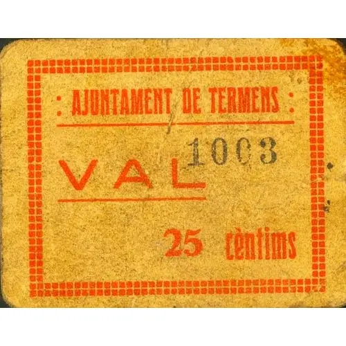 (Translation: City Council of Termens Voucher 25 Centimos)