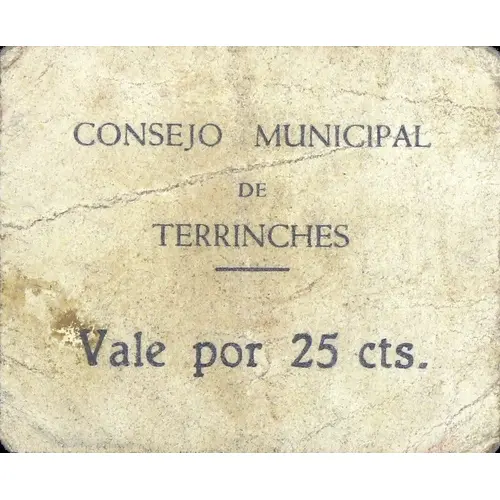 CONSEJO MUNICIPAL DE TERRINCHES Vale por 25 cts. (Translation: Municipal Council of Terrinches Voucher for 25 Centimos) |