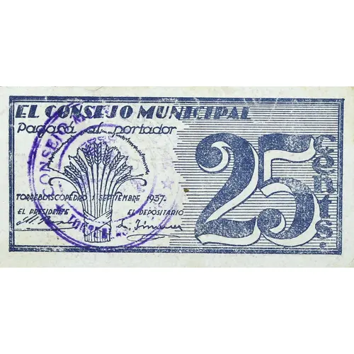 (Translation: The Municipal Council Will pay the bearer 25 Centimos Torreblascopedro, September 1, 1937)