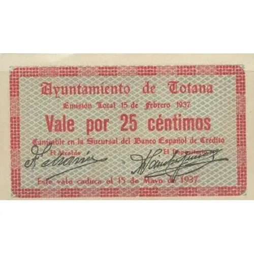 Ayuntamiento de Totana Emisión Local 15 de Febrero 1937 Vale por 25 céntimos Canjeable en la Sucursal del Banco de Español de Crédito Este vale caduca el 15 de Mayo de 1937 (Translation: City Council of Totana Local Issue February 15, 1937 Voucher for 25 Centimos Redeemable at the Branch of `Banco de Español de Crédito` This voucher expires on May 15, 1937) |