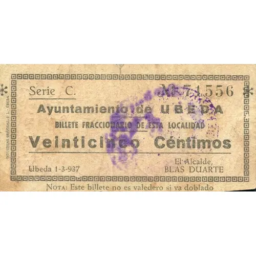 Ayuntamiento de UBEDA BILLETE FRACCIONARIO DE ESTA LOCALIDAD Veinticinco Céntimos Ubeda 1-3-937 NOTA: Este billete no es valedero si va doblado (Translation: City Council of Ubeda Fractional banknote of this locality Twenty-five Centimos Ubeda March 1, 1937 Note: This banknote is not valid if it is folded) |