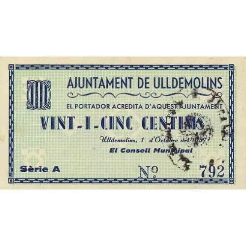 AJUNTAMENT DE ULLDEMOLINS EL PORTADOR ACREDITA D`AQUEST AJUNTAMENT VINT-I-CINC CENTIMS Ulldemolins, 1 d`Octubre del 1937 (Translation: City Council of Ulldemolins The bearer accredites from this City Council Twenty-five Centimos Ulldemolins, October 1, 1937) |