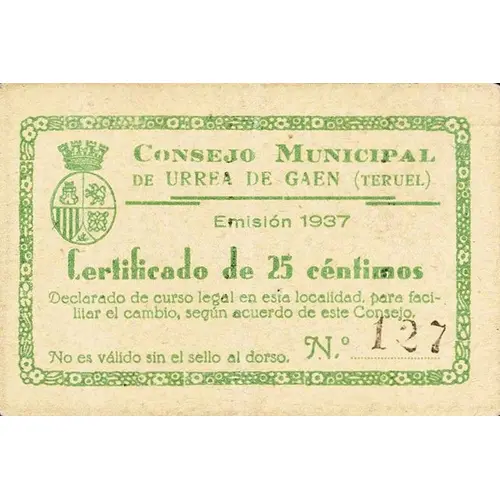 Obverse lettering CONSEJO MUNICIPAL DE URREA DE GAEN (TERUEL) Emisión 1937 Certificado de 25 céntimos Declarado de curso legal en esta localidad, para facilitar el cambio, según acuerdo de este Consejo. No es válido sin el sello al dorso.