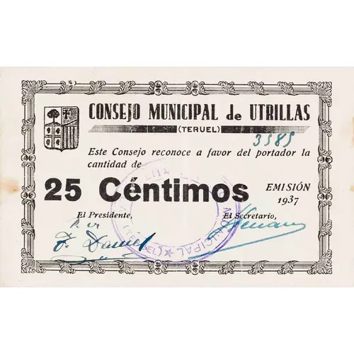 CONSEJO MUNICIPAL de UTRILLAS (TERUEL) Este Consejo reconoce a favor del portador la cantidad de 25 Céntimos EMISIÓN 1937 (Translation: Municipal Council of Utrillas (Teruel) This Council recognizes in favor of the bearer the amount of 25 Centimos Issue 1937) |