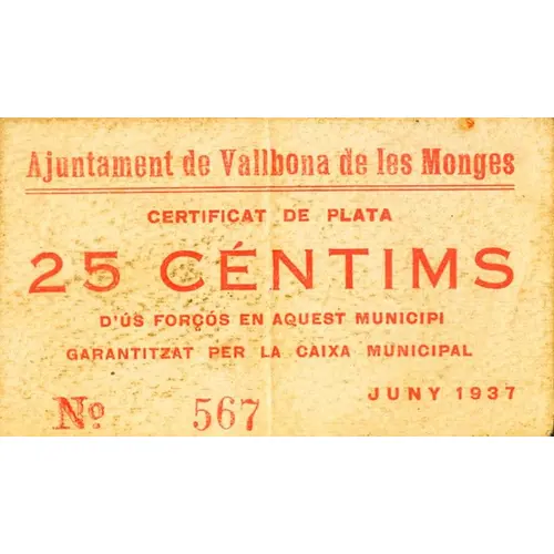 Ajuntament de Vallbona de les Monges CERTIFICAT DE PLATA 25 CÉNTIMS D`ÚS FORÇÓS EN AQUEST MUNICIPI GARANTITZAT PER LA CAIXA MUNICIPAL JUNY 1937 (Translation: City Council of Vallbona de les Monges Silver Certificate 25 Centimos Mandatory use in this Municipality Guaranteed by the Municipal Fund June 1937) |