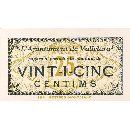 L`Ajuntament de Vallclara pagarà al portador la quantitat de VINT-I-CINC CÈNTIMS (Translation: The City Council of Vallclara Will pay the bearer the amount of Twenty-five Centimos) |