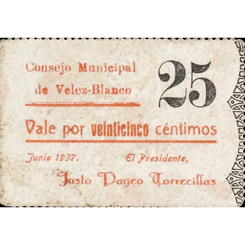 25 Consejo Municipal de Velez-Blanco Vale por veinticinco céntimos Junio 1937. (Translation: Municipal Council of Velez-Blanco Voucher for Fifty Centimos June 1937.) |