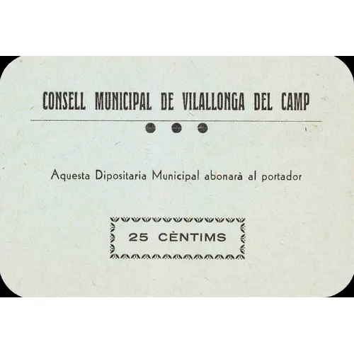 CONSELL MUNICIPAL DE VILALLONGA DEL CAMP Aquesta Dipositaria Municipal abonarà al portador 25 CÉNTIMS (Translation: Municipal Council of Vilallonga del Camp This Municipal Depository will pay the bearer 25 Centimos) |