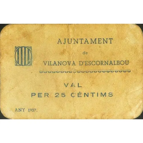 | Leyenda del anverso | AJUNTAMENT DE VILANOVA D`ESCORNALBOU VAL PER 25 CÉNTIMS ANY 1937. (Translation: City Council of Vilanova d`Escornalbou Voucher 25 Centimos Year 1937.) |