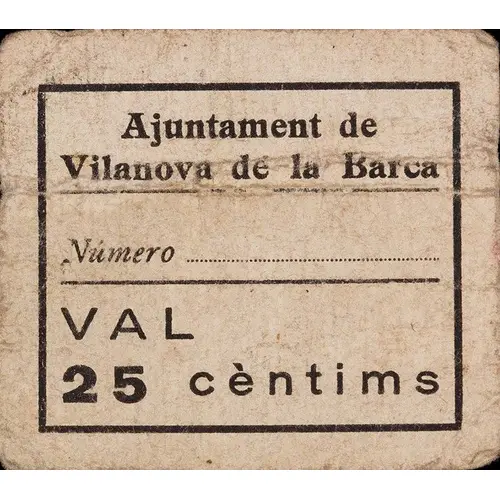 Ajuntament de Vilanova de la Barca VAL 25 cèntims (Translation: City Council of Vilanova de la Barca It is worth 25 Centimos) |