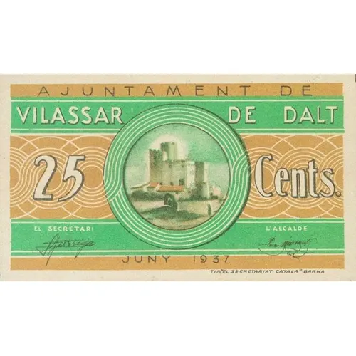 AJUNTAMENT DE VILASSAR DE DALT 25 Cents. JUNY 1937 (Translation: City Council of Vilassar de Dalt 25 Centimos June 1937) |