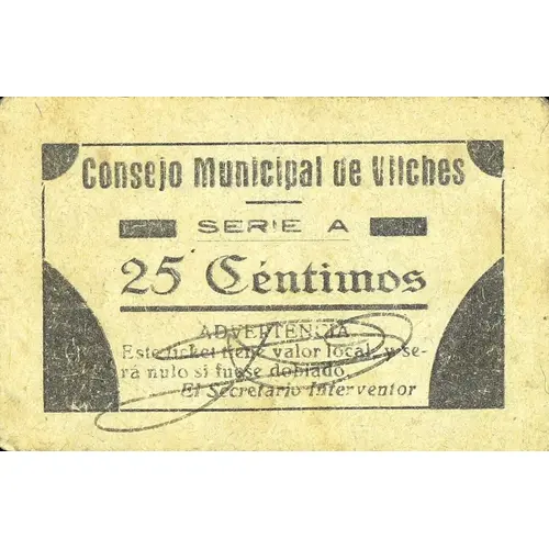 Consejo Municipal de Vilches 25 Céntimos ADVERTENCIA Este ticket tiene valor local y será nulo si fuese doblado. (Translation: Municipal Council of Vilches 25 Centimos Warning This ticket has local value and will be void if it is doubled.) |