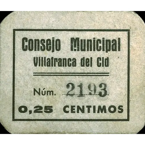 | Obverse lettering | Consejo Municipal Villafranca del Cid 0,25 CENTIMOS (Translation: Municipal Council Villafranca del Cid 0.25 Centimos) |