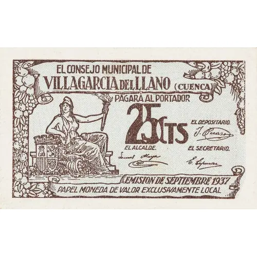 | Obverse lettering | EL CONSEJO MUNICIPAL DE VILLAGARCIA DEL LLANO (CUENCA) PAGARÁ AL PORTADOR 25 CTS EMISION DE SEPTIEMBRE 1937 PAPEL MONEDA DE VALOR EXCLUSIVAMENTE LOCAL (Translation: The Municipal Council of Villagarcía del Llano Will pay the bearer 25 Centimos Issue of September 1937 Paper money of exclusively local value) |