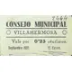 CONSEJO MUNICIPAL VILLAHERMOSA Vale por 0`25 céntimos. Septiembre 1937 (Translation: Municipal Council Villahermosa Voucher for 0.25 Centimos September, 1937) |