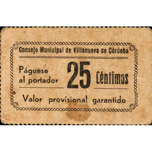 (Translation: Municipal Council of Villanueva de Córdoba Pay the bearer 25 Centimos Guaranteed provisional value)