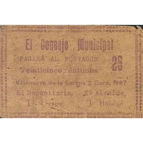 25 El Consejo Municipal PAGARÁ AL PORTADOR Veinticinco céntimos Villanueva de la Serena 2 Dbre, 1937 (Translation: The Municipal Council Will pay the bearer Twenty-five Centimos Villanueva de la Serena, December 2, 1937) |