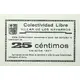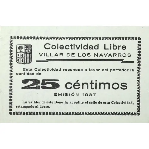Colectividad Libre VILLAR DE LOS NAVARROS Esta Colectividad reconoce a favor del portador la cantidad de 25 céntimos EMISIÓN 1937 La validez de este Bono la acredita el sello de esta Colectividad, estampado al dorso (Translation: Free Collectivity Villar de los Navarros This Collectivity recognizes in favor of the bearer the amount of 25 Centimos Issue 1937 The validity of this Bond is accredited by the stamp of this Collectivity, stamped on the back) |