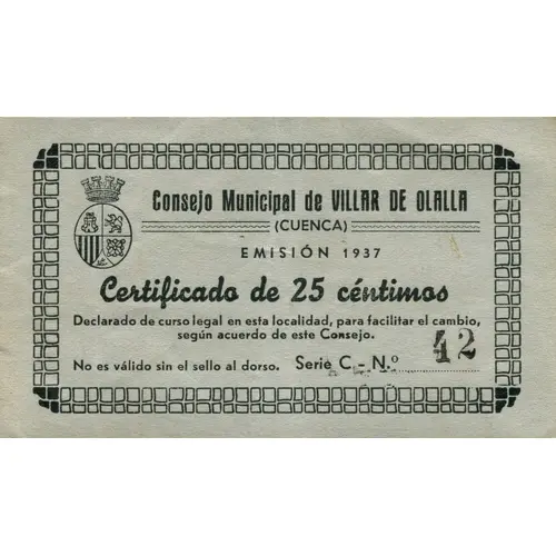 Consejo Municipal de VILLAR DE OLALLA (CUENCA) EMISIÓN 1937 Certificado de 25 céntimos Declarado de curso legal en esta localidad, para facilitar el cambio, según acuerdo de este Consejo. No es válido sin el sello al dorso. (Translation: Municipal Council of Villar de Olalla (Cuenca) Issue 1937 25 Centimos certificate Declared legal tender in this locality, to facilitate the change, according to the agreement of this Council. Not valid without stamp on back.) |