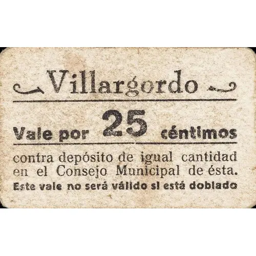 Villargordo Vale por 25 céntimos contra depósito de igual cantidad en el Consejo Municipal de ésta. Este vale no será válido si está doblado (Translation: Villargordo Voucher for 25 Centimos against deposit of the same amount in the Municipal Council of this. This voucher will not be valid if it is folded) |