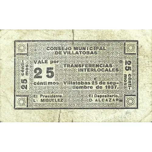 CONSEJO MUNICIPAL DE VILLATOBAS VALE por 25 céntimos TRANSFERENCIAS INTERLOCALES Villatobas 25 de septiembre de 1937. (Translation: Municipal Council of Villatobas Voucher for 25 Centimos Interlocal transfers Villatobas September 25, 1937.) |