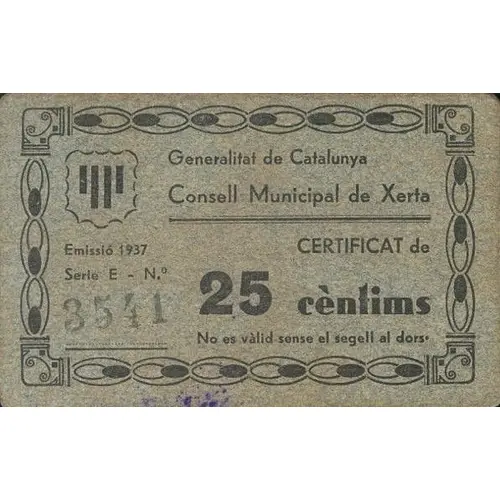 Generalitat de Catalunya Consell Municipal de Xerta CERTIFICAT de 25 cèntims Emissió 1937 No es vàlid sense el segell al dors. (Translation: Generalitat of Catalonia Municipal Council of Xerta Certificate of 25 Centimos Issue 1937 It is not valid without the stamp on the back.) |