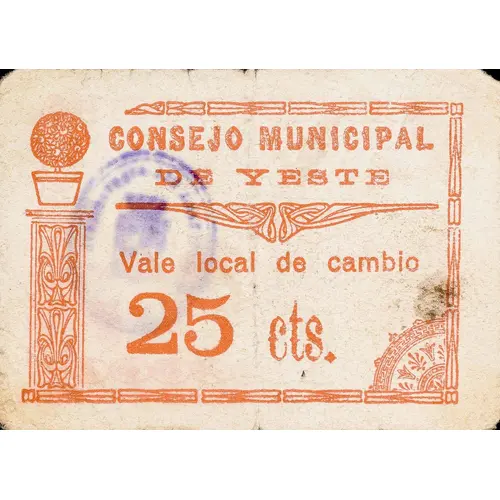 VALE LOCAL DE CAMBIO 25 CTS. YESTE (Translation: Local exchange voucher 25 Centimos Yeste) |