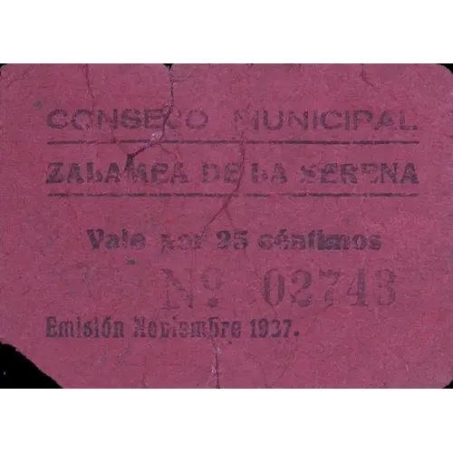 CONSEJO MUNICIPAL ZALAMEA DE LA SERENA Vale por 25 céntimos Emisión Noviembre 1937. (Translation: Municipal Council Zalamea de la Serena Voucher for 25 Centimos Issue November 1937.) |