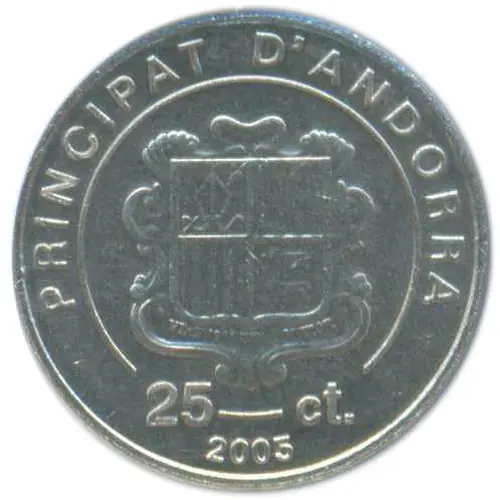 | Chữ khắc mặt trước | PRINCIPAT D`ANDORRA VIRTVS VNITA FORTIOR 25 ct. 2005 (Translation: Principality of Andorra United virtue is stronger) |