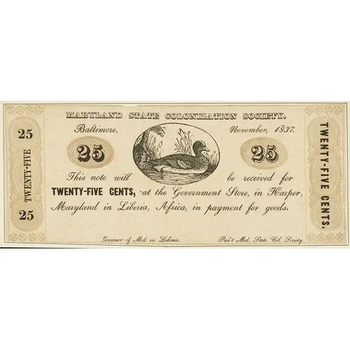| Obverse lettering | MARYLAND STATE COLONIZATION SOCIETY. Baltimore, November, 1837. 25 This note will be received for TWENTY-FIVE CENTS, at the Government Store, in Harper, Maryland in Liberia, Africa in payment for goods. |