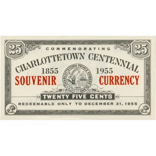 | Obverse lettering | COMMEMORATING CHARLOTTETOWN CENTENNIAL 1855 1955 SOUVENIR CURRENCY TWENTY FIVE CENTS REDEEMABLE ONLY TO DECEMBER 31, 1955 |