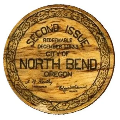 | Obverse lettering | SECOND ISSUE REDEEMABLE DECEMBER 1, 1933 CITY OF NORTH BEND OREGON I N HARTLEY TREASURER EDGAR McDANIEL MAYOR |