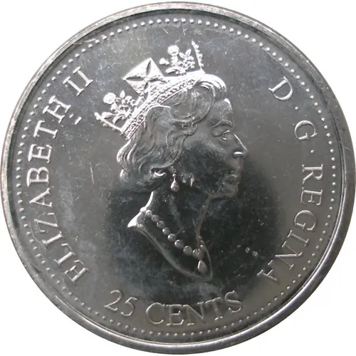 | Averslegende | 25 CENTS ELIZABETH II D•G•REGINA (Translation: Elizabeth II Queen by the grace of God) |