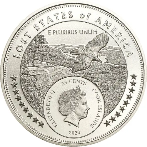 | Obverse lettering | LOST STATES OF AMERICA E PLURIBUS UNUM ELIZABETH II 25 CENTS COOK ISLANDS IRB 2020 |